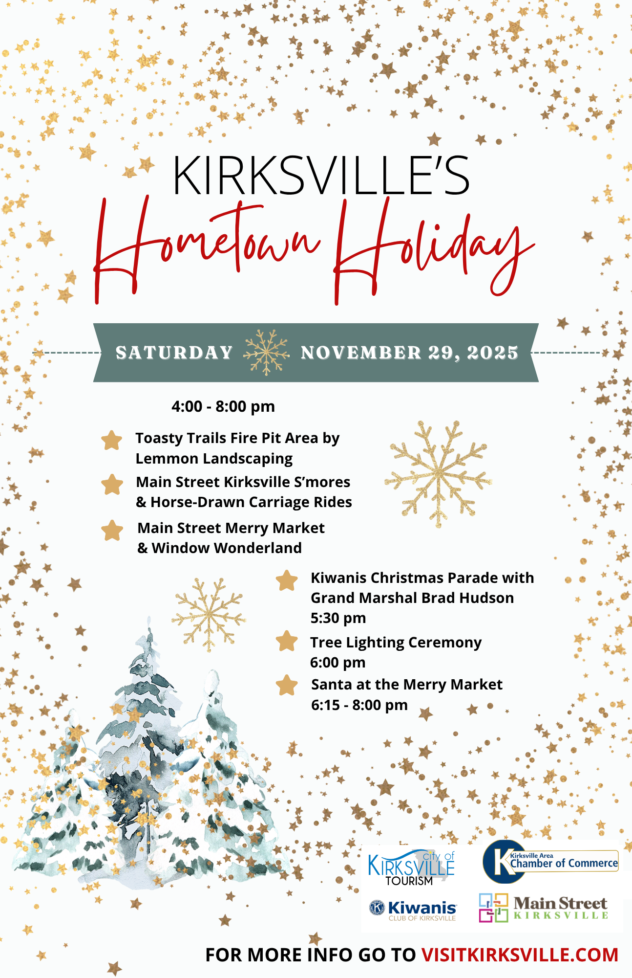 The #Kirksville #Kiwanis #Christmas Parade returns as part of Kirksvilleās Hometown Holiday celebration in #DowntownKirksville! The 14th annual parade will be held Saturday, November 29th, 2025, at 5:30 PM starting along Franklin Street and traveling around the Square! The theme for this year's parade is āRockin' Around the Christmas Treeā with Parade Grand Marshal, Brad Hudson!